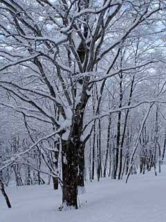 下りも密林の中で斜滑降とボーゲンの繰り返しだが、密なので枝を払ったり、木に抱きついたりの繰り返しで全く不快である。よくこんな所へスキーで来たと自分でも思う。雪上ハイキングに来た人が数人いたが、我々はよほどの変人と見たのではないか。
