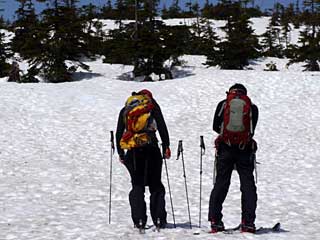 今回の私の道具立ては、たまたま車にブラストラック・ブレイザーとそれに対応するシールが積んであったので、テレマークではなくヒールフィックスのピンテックブーツ(スカルパ・マエストラーレ)とマーカー・キングピンビンディングである。ウォークモードでは爪先の両脇しか止まっていないので、ハイクアップの際は非常に軽く脚が出る。NTNビンディングのテレマークより足送りは軽く感じた。しかし、稜線アップダウンのわずかな降りをシール装着のままヒールフリーで滑ろうとすると、爪先だけで止まっている故にとても怖い。雪質の問題もあるだろうが、アップダウンがあるコースではテレマークに分があるように思う。微妙な登りができ、シール装着のまま滑ることも難しくない(慣れの問題だろうか?)。
