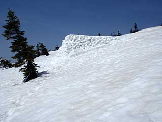 巨大キッカーが・・よく喋るおじさんで、聞きもしないのに昨日の状況や連休前半に何も知らないで上がってきたヒトを連れて歩いたことを話してくれた。このあたり、春になると何の装備も持たず、どこを滑ればいいかも知らずに板を担いで登ってくる輩が結構いるので、危うさを感じることが多い。そういう輩には冷たく接したほうがいいと私などは思っているが、このリピーターおじさんはまるでボランティアでガイドをしているかのようなのだ。この日も午後になってコース上で再会した時、明らかに同行者ではないゲレンデスキーの男性を引き連れ、解説をしていた。