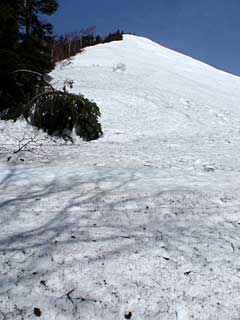 閉鎖されたコースを登りきるのに1時間ちょっとかかった。かつてコースだったところに生えた木が雪の下になっておらず、閉鎖期間に生長したことがわかる。