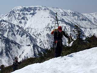 ステップで出発9時20分、ゲレンデトップの1830mからおもむろに歩き始める。シール装着の時間が省け、非常に快適なスタートであるが、最初はステップで登れる限界斜度が体にしみ込んでいないので時々前のめりになる。神楽ヶ峰へつづく緩い尾根の右側から鞍部へトラバース、1984mピークへ斜登行で巻きながら登る頃にはもう強烈な日差しと暑さで汗だくである。先行者は中尾根を滑るという男性と、この日コースの所々で出会うことになるリピーターの山スキーヤーのおじさん。