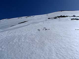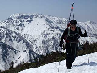 吐月工房氏と日程を合わせ、バイクツーリングかバックカントリースキーか悩んだ揚げ句、かぐらスキー場から何度も経験のあるルートを選択。前日が悪天候だったので、標高2000mでは雪が降ったかもしれない。