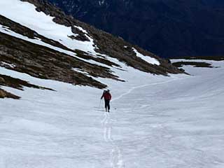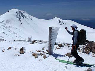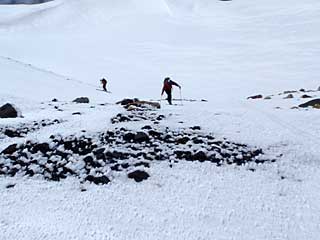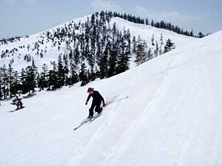 12時過ぎ、2,300mの外輪山稜線に立つ。シールを剥がして、北側の急斜面にドロップ。かつて雪が降る中を無理押しして滑り込んで、雪崩を誘発したことがある恐ろしい斜面だが、今回は比較的落ち着いていた。ボトムまでの約500mくらいを一人づつ滑るが、雄叫びが自然と出てしまうような爽快感だった。それにしても、山スキーヤーのぶっといロッカースキーやスノーボードのスピードの速いこと。浮力があるとああも違うのか・・