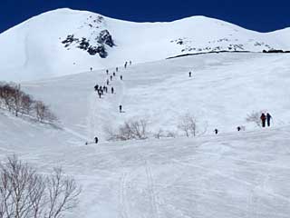 最後の斜面シュプールでギタギタになった位が原に到着したのが午後3時近く。午前中山頂近くに大挙していたスキーヤー・ボーダーたちは下山してしまったようだ。それが証拠に最長雪渓は夕方のゲレンデ状態となっている。ここで山荘に宿泊してもう一日シークレットコースを攻める中野君たちと別れ、一人ツアーコースへ。最後の大斜面を滑っていた頃、ツアーコースの最初の急斜面あたりに救助ヘリがきていた。誰かケガをしてヘリを呼んだに違いない。一人でケガなどしたら目も当てられないので、コブ斜面になった細いツアーコースをアルペンターンで滑っていく。何組ものパーティを抜き去ったが、その中にT.M.Nスキースクールの望月さん御一行がいた。思わず声をかけてしまった。