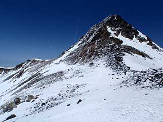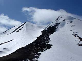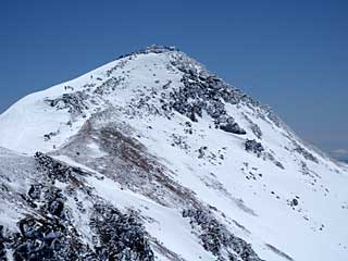 別のアングルから剣が峰前日雪が降ったので、新雪とザラメが入り交じっている。新雪部分は標高が高くなると固く凍った状態。朝日岳直下で滑落するテレマーカーもおり(これはシール登行があまり上手くない人かもしれぬ)、なるべく柔らかい部分を選んで登った。雪面に小さなエビノシッポが無数に生えており、まるでマイタケを踏みながら歩いているようだ。