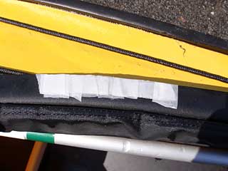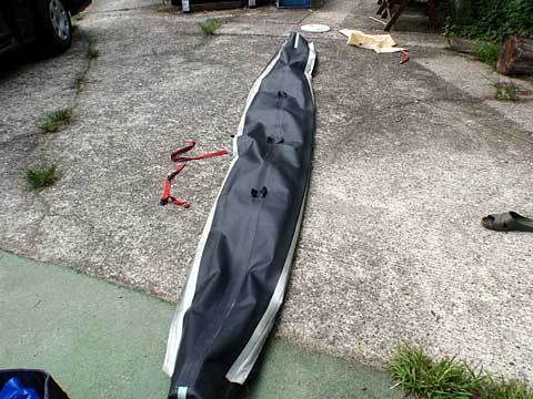 破裂の状況を確かめた時に左側のスポンソンは奄美で抜いてあり、ガイドとしての細引きが替わりにスリーブに入っているが(交換の際、長い細引きは絶対に必要)、ふとしたことから細引きがスリーブの奥に入ってしまい、それを取りだすのに一苦労。そして新品のスポンソンを細引きに結んでスリーブに入れるのだが、スリーブを通している間に細引きがほどけてしまってまた一苦労。これをやるとスポンソンのねじれを取る作業が大変。ちょうど日が照ってきて汗みどろである。