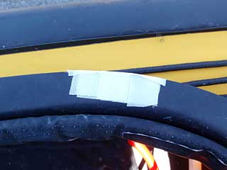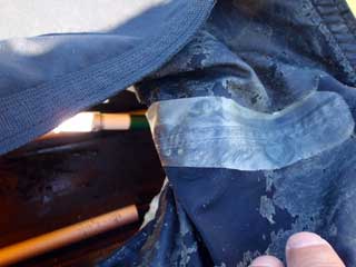 さて、気になっていたのは前回使用したカサラノの船体布に砂が若干付いていたのと、バウ・スターンハッチの部分の防水目止めテープが剥がれかかっていることだ。カサラノは中古でちょうど6年前の11月に手に入れたのだが、最近の使用頻度が高いので劣化も著しい。ハッチ部分のコーデュラナイロンのウレタンコーティングは剥がれ、目止めテープはその役目を果たしていない。こういう部分にこそ、以前買ったティアエイドが有用なのではないかと思っていた。