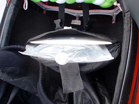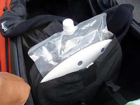 さらに、シートの背もたれ部分には、これまた100円ショップにあったプラティパスもどきのぺちゃんこになる水筒。3.9Lタイプを買って入れたらちょうどサイズ的によかった。水を入れてもシートクッションになると思うが、今回は息を軽く吹き込んでスクリューキャップをしただけ。それなりに背中が快適になった。