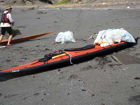 二人で赤羽根海岸に上陸してペットボトルゴミを拾いまくった。ゴミ袋6つ分となり、大漁。各自3つのポリ袋を積んでいくのは至難の業だが、バイク用の荷物固定用バンジーコード(バイクに乗っていた時から持っていたもの)を今回持ってきた。私の初期型カフナのスターンデッキは予備パドルを固定するのもノーマルでは心もとないので、このバンジーコードがツーリング時にも役立ちそう。