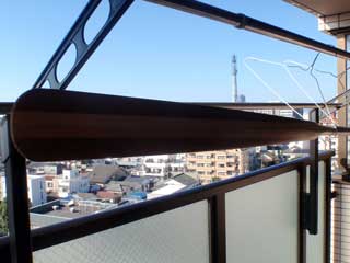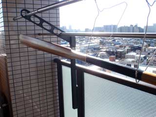 乾きがいいように、ベランダに針金ハンガーを2つかけてその中を通してからウエスで桐油を軽く塗る。あまり塗りすぎると後々ベタつくので、あくまで軽く。ウエスに付けた油の量はほんの指先で浸すほど。オイルの伸びがいいのでこれで十分である。